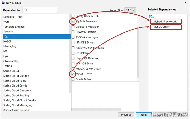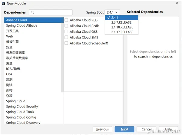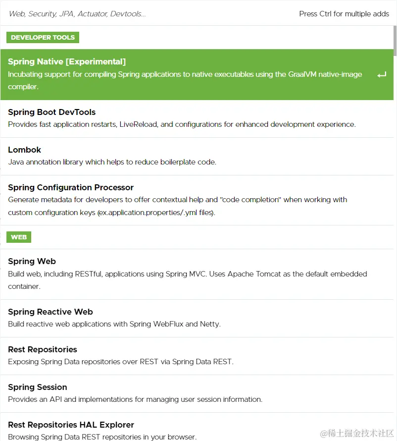 - SpringBoot程序中需要使用何种功能通过勾选选择技术,也可以手工添加对应的要使用的技术(后期讲解)