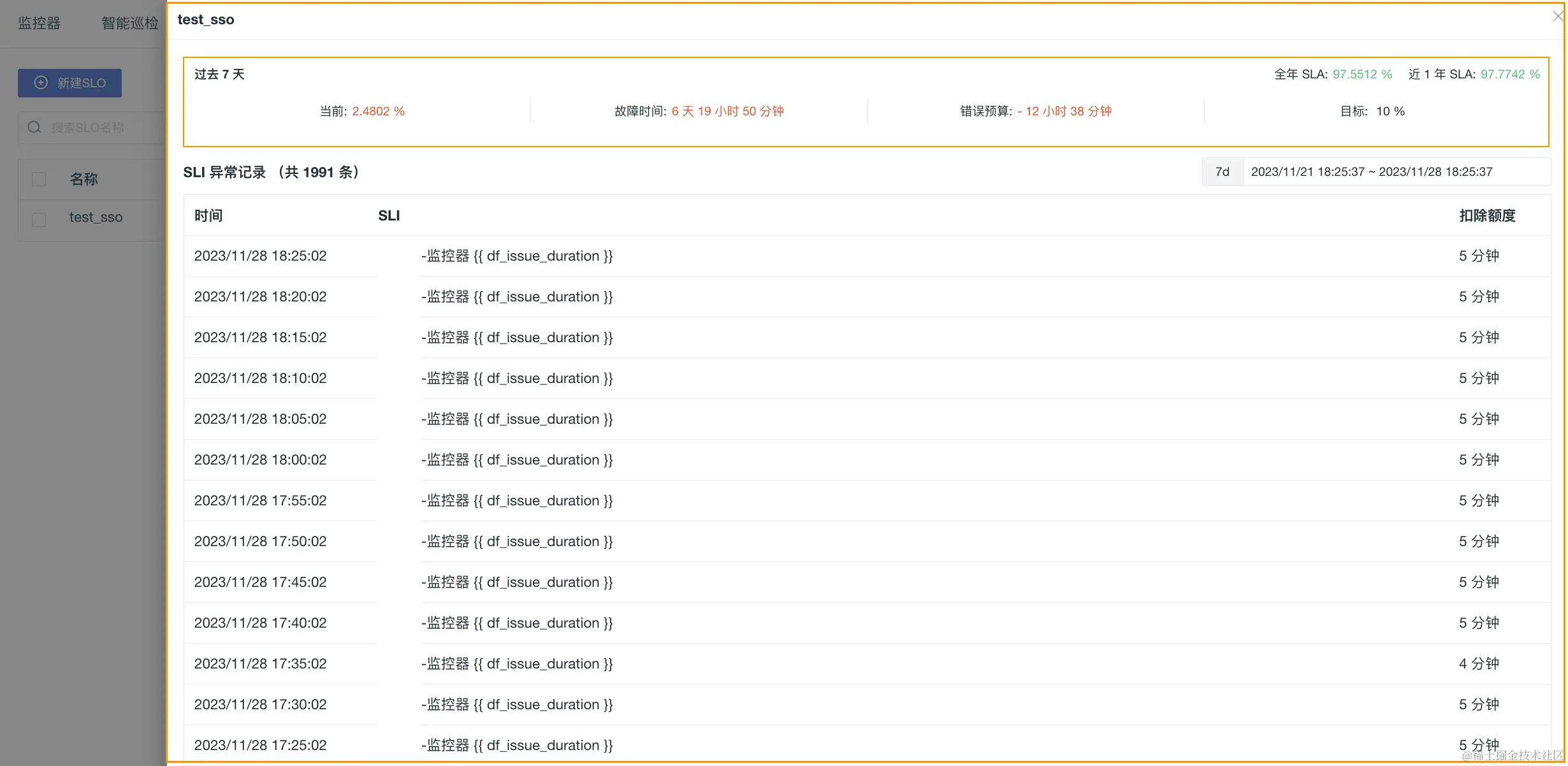 | SLI 异常记录 | 基于当前 SLO 任务下的监控器所触发的异常事件。 |
