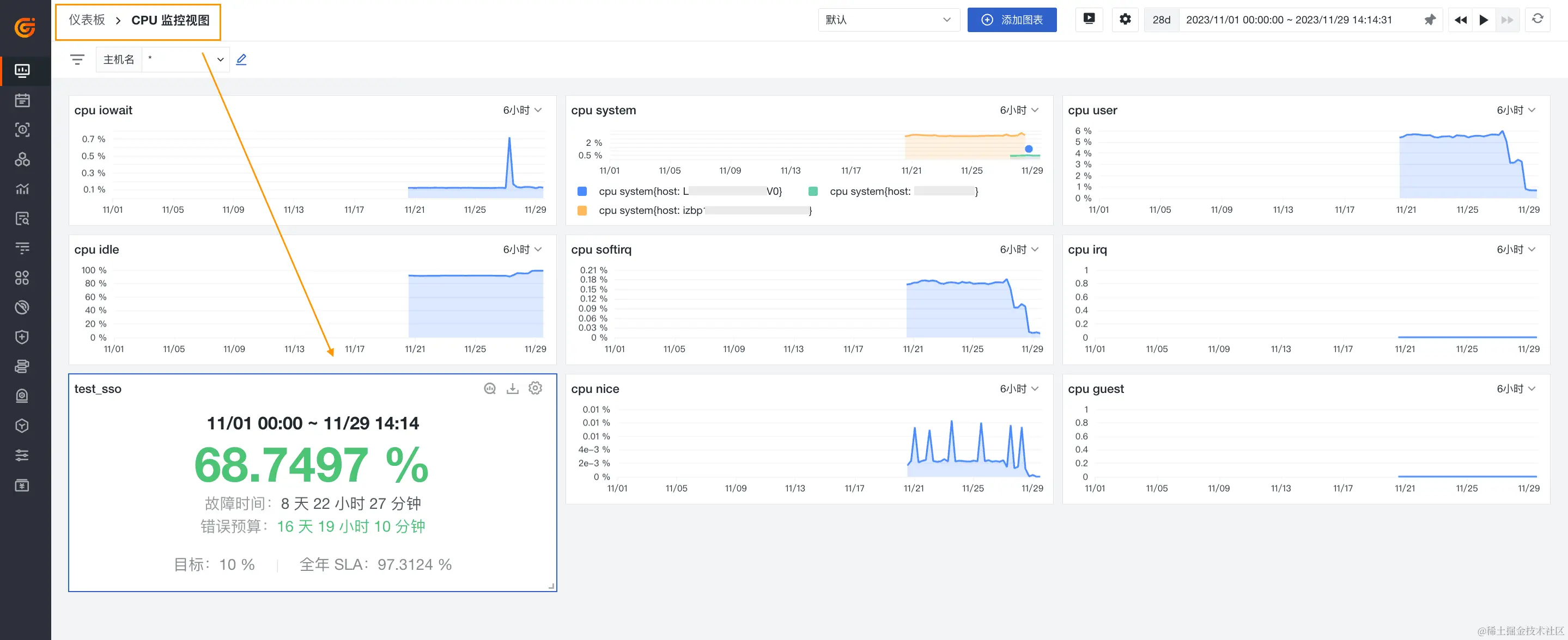 当组织内多个团队实施不同的 SLO 任务,那么将 SLO 的任务状态可视化能进一步帮助各团队设置任务优先级、解决问题。借助应用到仪表板的可视化办法,我们可以以一种更加全方位的方式与任何利益相关者共享这些 SLO 的实时状态。如下图,我们将该条 SLO 任务直接导出到仪表板。在仪表板内,我们可以看到 SLO 的状态、故障时间、错误预算、全年 SLA 等关键信息。