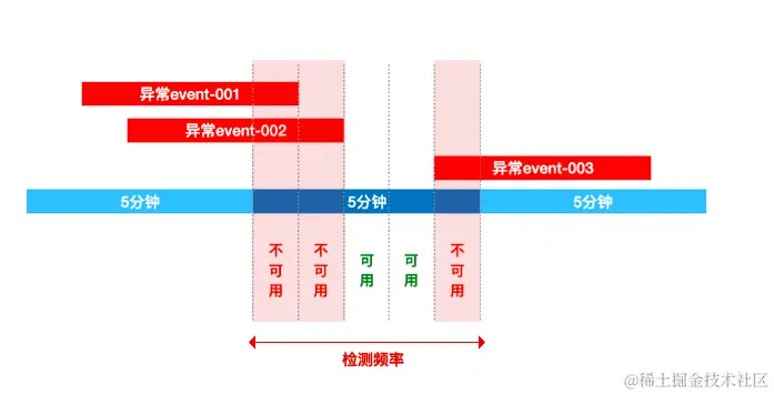 对于观测云来说,SLO 是进行 SLA 评分处理的最小单元,是一个时间窗口内 SLI 累积成功数的目标。而我们又经常把 SLO 转化为错误预算,用于计算可容忍的错误数,在每一个检测周期内出现异常事件的时间将在可容错时长中扣除。如下图:假设 SLO 检测周期为 5 分钟,根据叠加后,异常事件覆盖时间为 3 分钟,扣除额度 3 分钟。