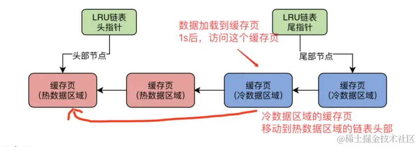 mysql热数据前面1/4的缓存页访问到,不移动到头部,后3/4访问才移动,频繁移动对性能有损失。