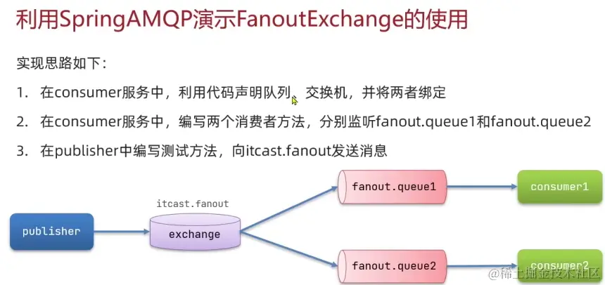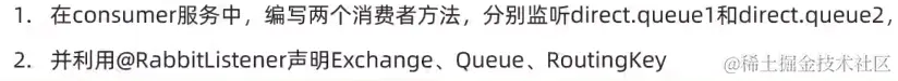在consumer的SpringRabbitListener中添加两个消费者,同时基于注解来声明队列和交换机: