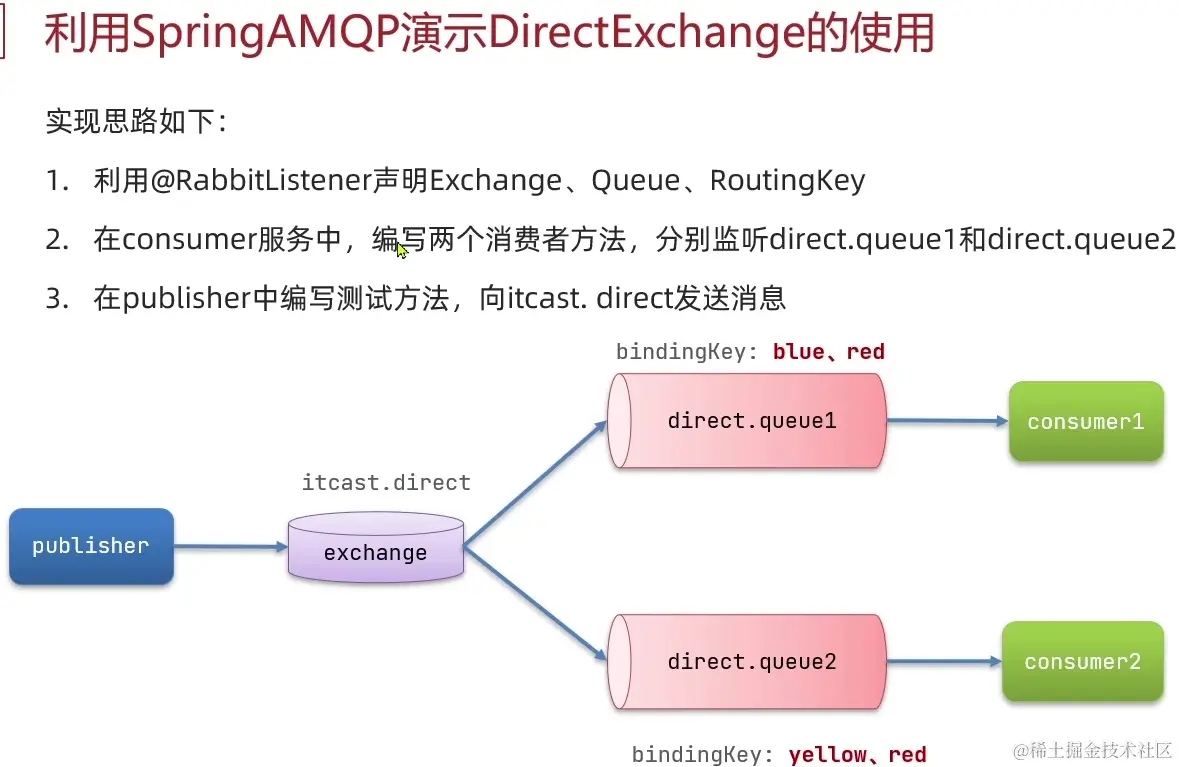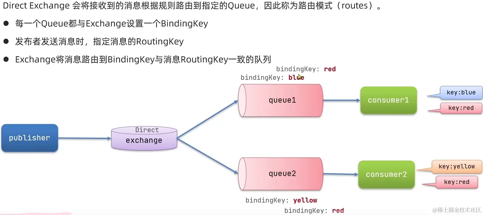 - Exchange不再把消息交给每一个绑定的队列,而是根据消息的Routing Key进行判断,只有队列的Routingkey与消息的 Routing key完全一致,才会接收到消息