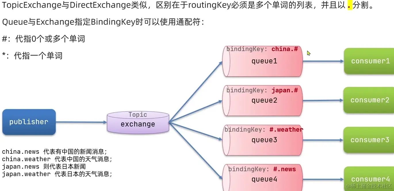 Topic类型的Exchange与Direct相比,都是可以根据RoutingKey把消息路由到不同的队列。只不过Topic类型Exchange可以让队列在绑定Routing key 的时候使用通配符!