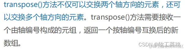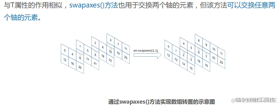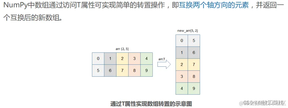 数组的转置指数组中各元素按照一定的规则变换位置。NumPy中提供了三种实现数组转置的方式,分别为T属性、transpose()方法、swapaxes()方法。