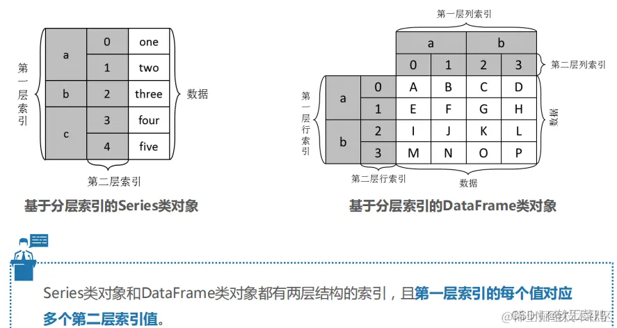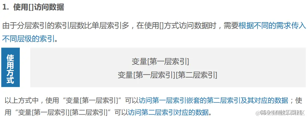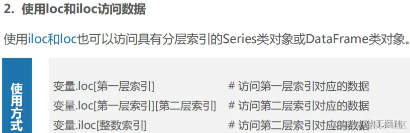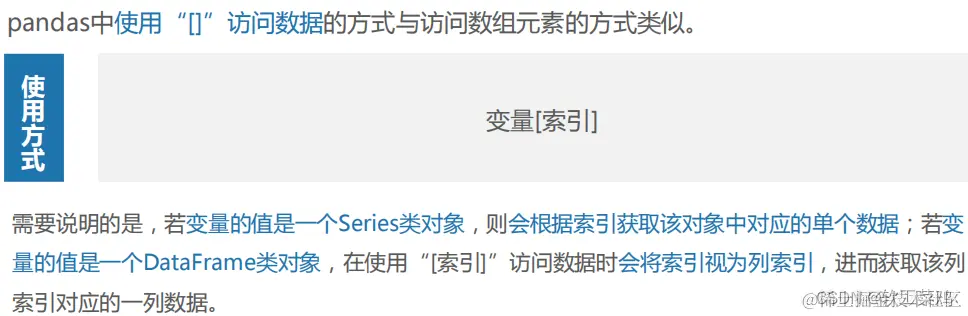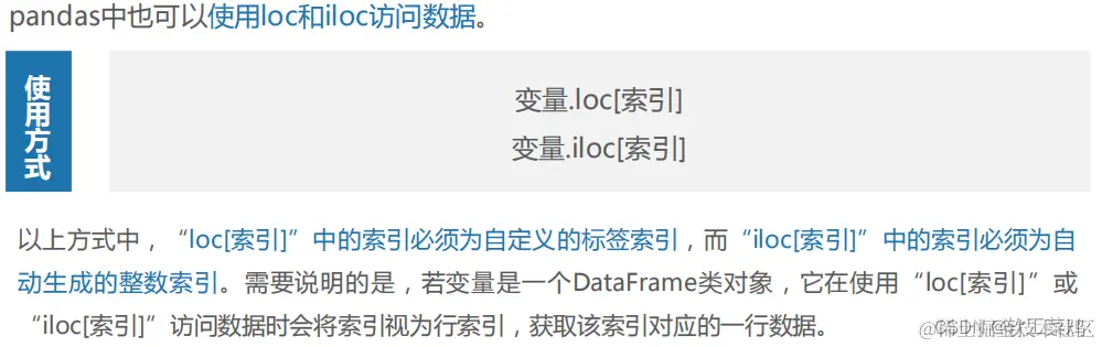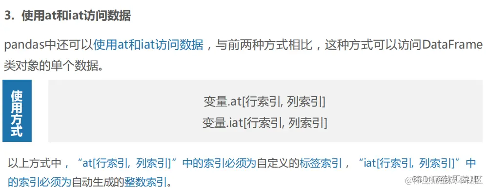 pandas 中 可 以 使 用 [] 、 loc 、 iloc 、 at 和 iat 这几 种 方 式 访 问 Series 类对 象 和DataFrame类对象的数据。