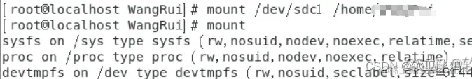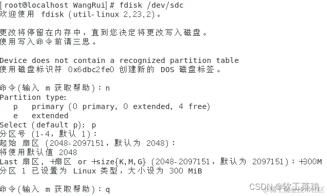 2.在字符终端用fdisk命令创建一个大小为300M的新分区,文件系统为ext4。用mount命令将分区挂载在/home/你的姓名拼音目录下,用mount命令验证是否挂载成功
