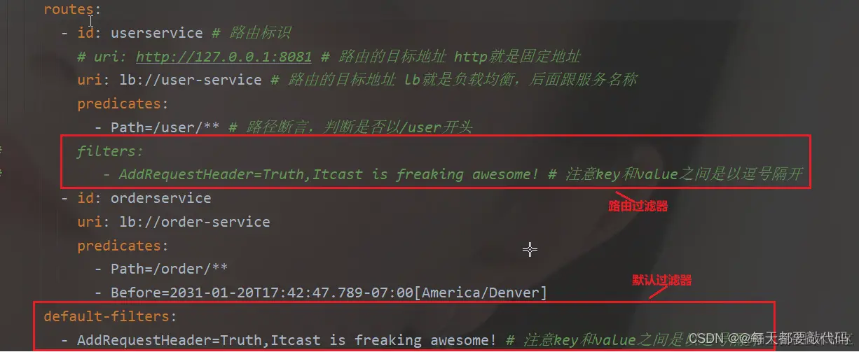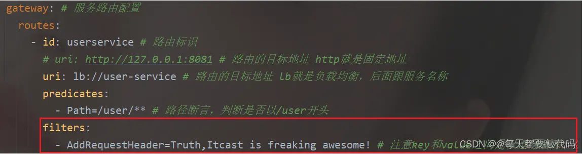 - AddRequestHeader=Truth,Itcast is freaking awesome! # 注意key和value之间是以逗号隔开