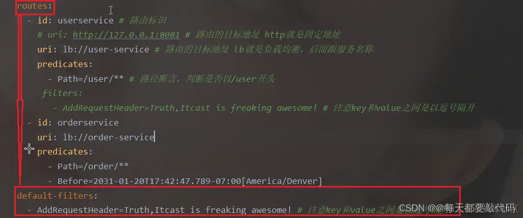 - 对于路由过滤器和默认过滤器default-filter从配置文件来看配置方式相同: