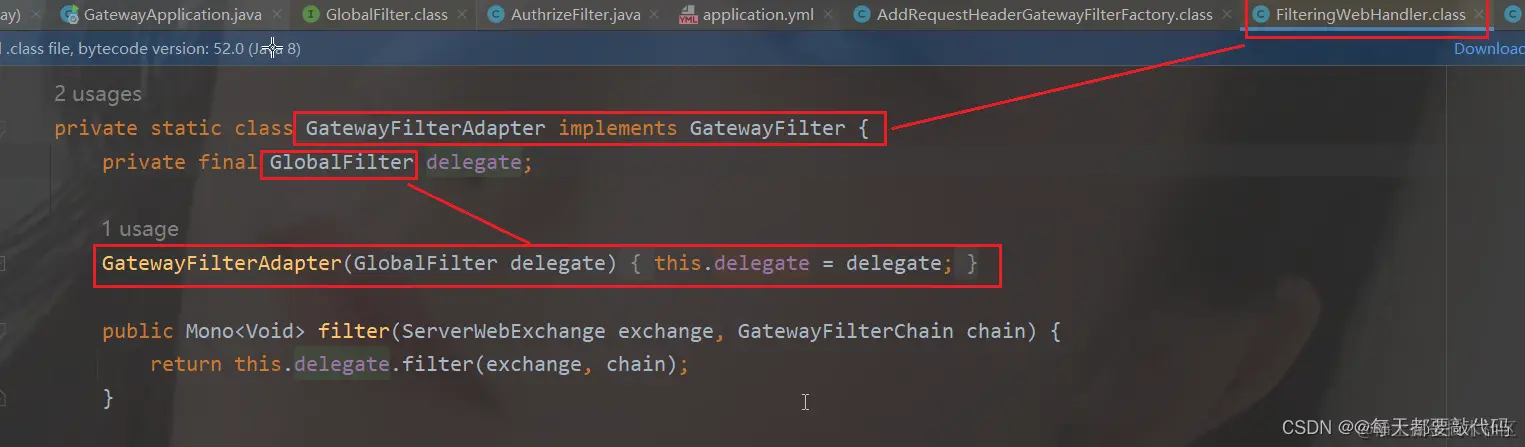 - 在FilteringWebHandler类里面有一个FilteringWebHandler(过滤器适配器)这个类适配器实现了GatewayFilter接口,在适配器内部又接收了一个全局过滤器参数GlobalFiter;通过适配器模式进行传参当做GatewayFilter来使用,这样就建立了联系!