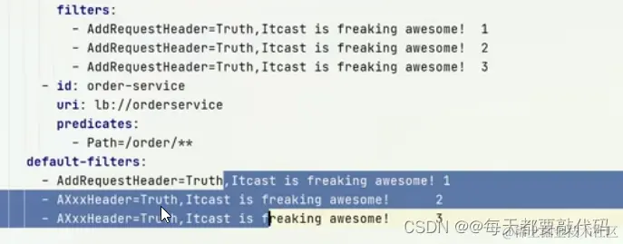 ③对于路由过滤器和默认过滤器我们并没有去指定顺序!路由过滤器和默认过滤器defaultFilter的order由Spring指定,默认是按照声明顺序从1递增。例如: