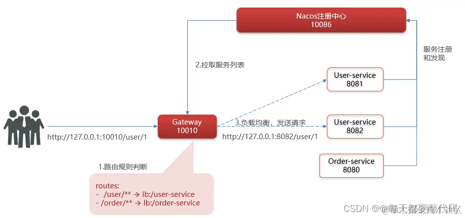 ②服务路由、负载均衡: 放行过后,问题又来了,当用户放松请求处理业务时,网关肯定处理不了业务,需要把请求给对应的微服务;但是需要判断是发给order-service还是user-service进行处理?每一个微服务后面肯定有很多实例,所以还需要进行服务路由和负载均衡!