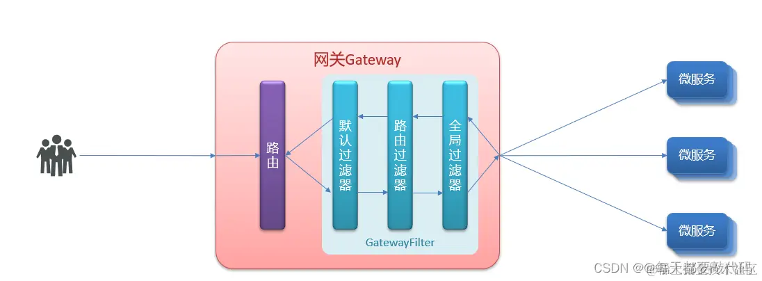 ①org.springframework.cloud.gateway.route.RouteDefinitionRouteLocator#getFilters() 方法是先加载defaultFilters,然后再加载某个route的filters,然后合并。②org.springframework.cloud.gateway.handler.FilteringWebHandler#handle()方法会加载全局过滤器,与前面的过滤器合并后根据order排序,组织过滤器链。