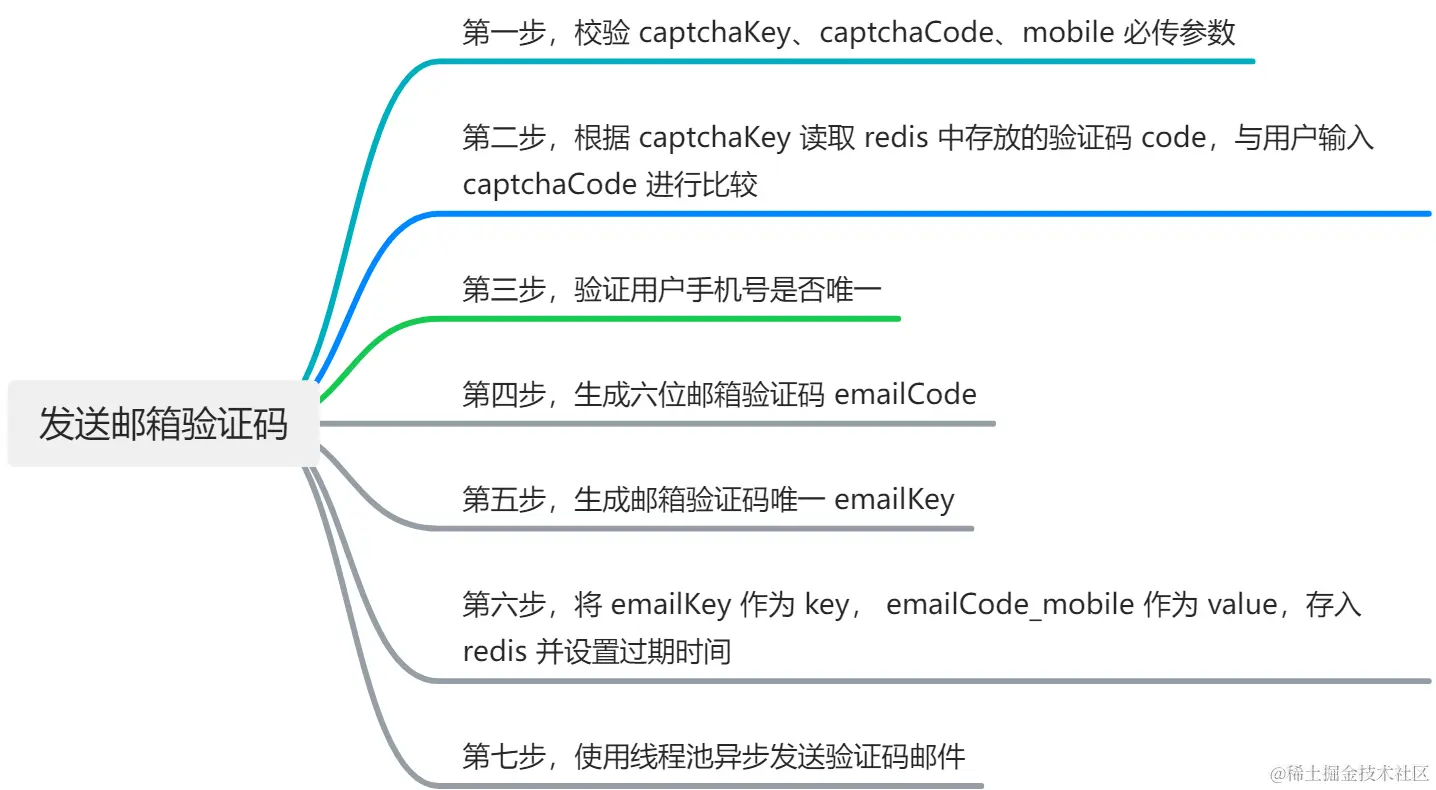 - 第六步,将 emailKey 作为 key, emailCode_mobile 作为 value,存入 redis 并设置过期时间(注意这一步将用户手机号,也存入 Redis 是为了防止用户在获取完邮箱验证码后修改手机号,这一点很重要,很多开发同学都忘了这一步)