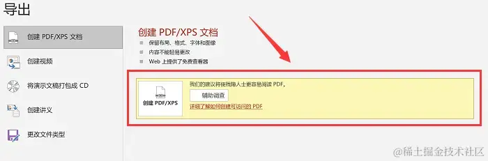 步骤1:在PowerPoint中,选择 【文件】 >【导出】>【创建PDF/XPS文档】;