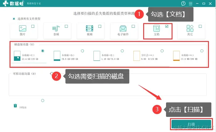 步骤1:下载软件后先点击【免费试用】, 进入选择界面,勾选【文档】,并选择需要扫描的磁盘后,点击 【扫描】 ;