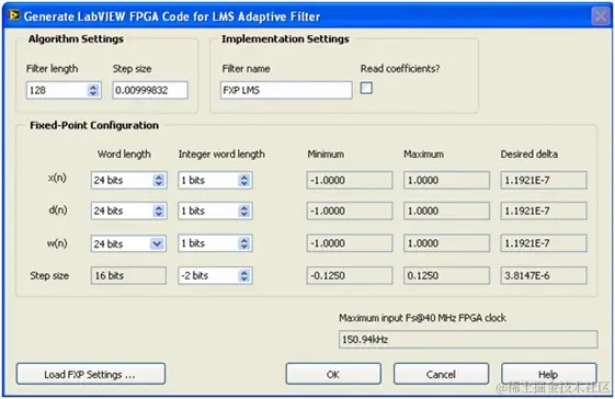 LabVIEWFPGA模块的IP发生器提供了一种生成定点LMS自适应滤波器,以在FPGA上运行的方法。下图显示了定点LMS自适应滤波器的配置对话框。可以在此配置对话框中指定参数。
