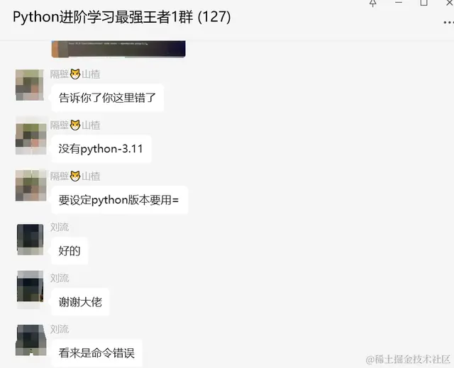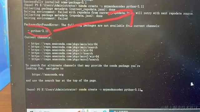 并且指出命令的错误:没有python-3.11,要设定python版本要用=。