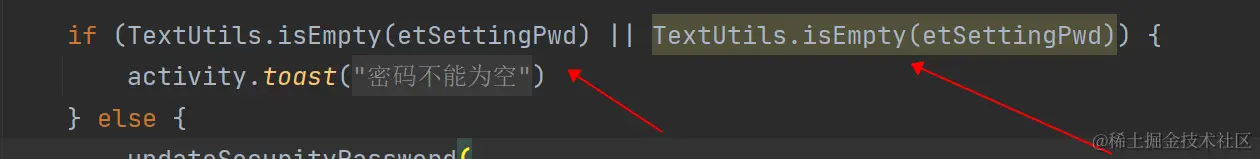 就比如下面这段代码,就不得不让人笑出声,有问题吗?哎,你还别说,运行手机上之后,只从功能上看,还真没问题,你让测试同学测10天,也很难从功能上排查出来,因为同样的判断,一次和多次是一样的,但是,从代码上看,就很直观的看出问题了,这样冗余且累赘的判断,简直毫无意义。