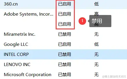 第二步:选中不需要在系统启动时自动运行的应用程序,点击底部的 “禁用” 按钮。
