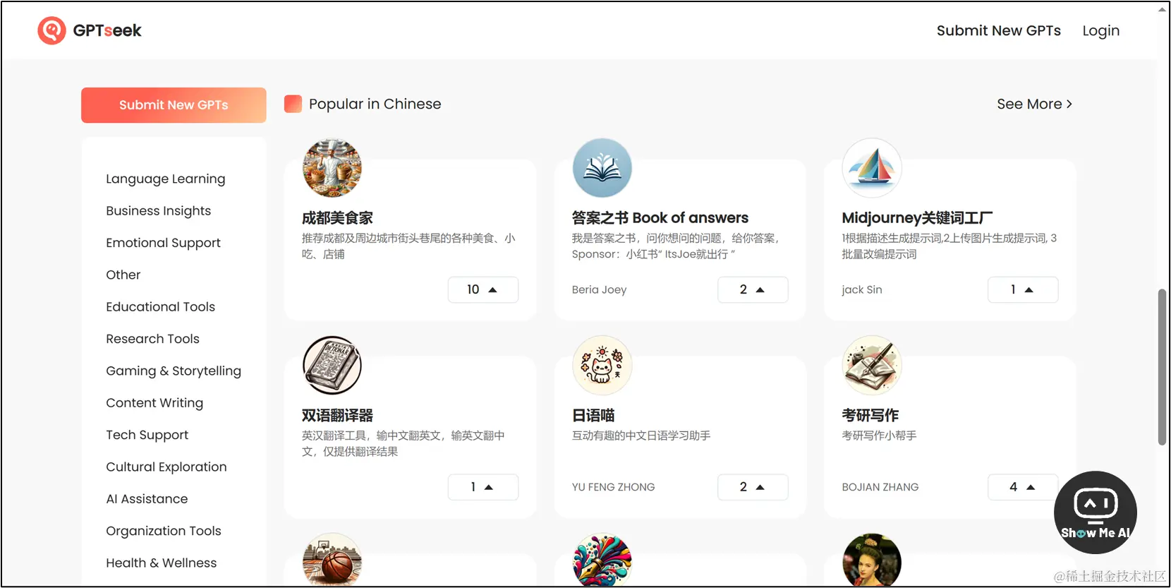 GPTseek 网站的解决方案不错!根据社区投票数量作为排名依据,并按照营销、编程、娱乐、商业、教育、研究、游戏等将 GPTs 分成了二十多类,还有一个「Popular in Chinese」中文专区,实用性很棒!