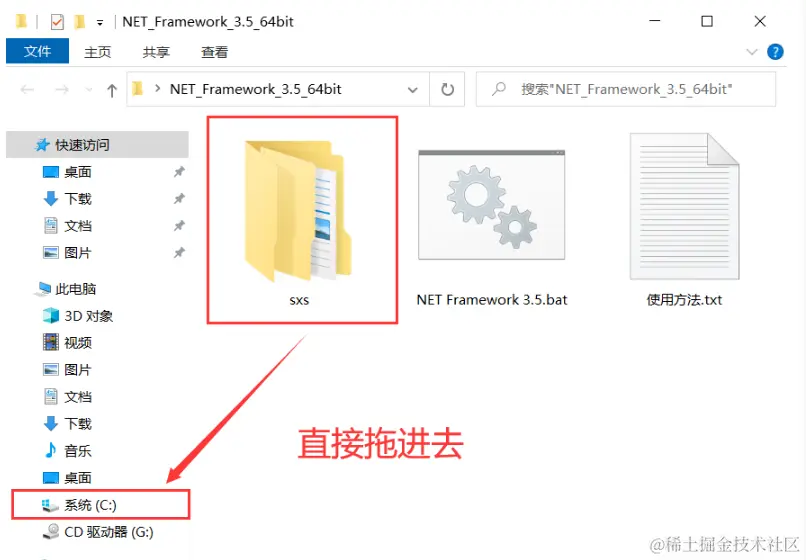 把解压得到【sxs】文件夹复制到C盘根目录,直接拖进C盘也行。