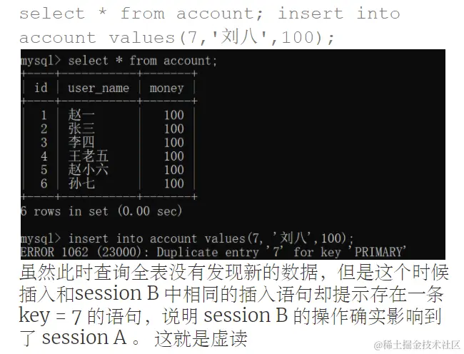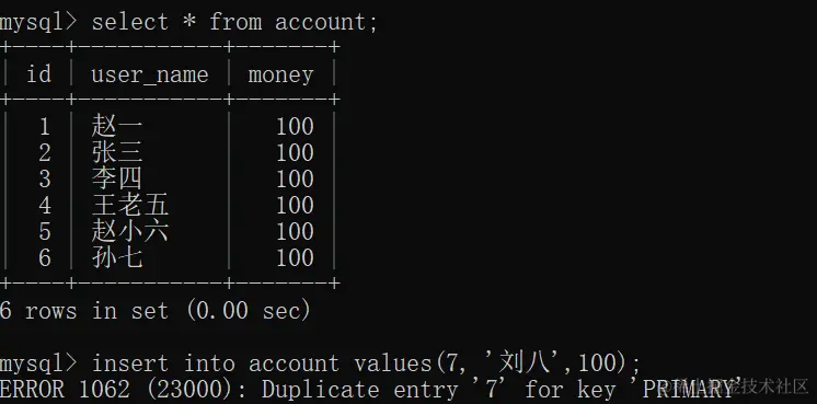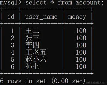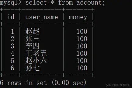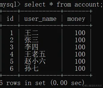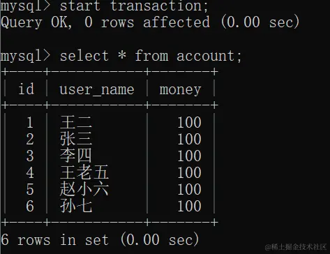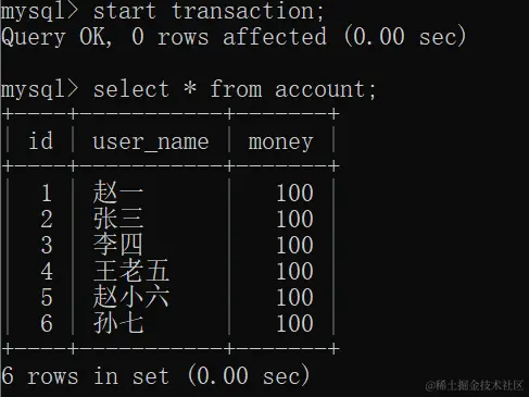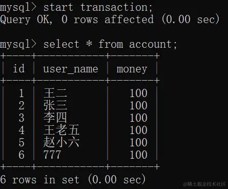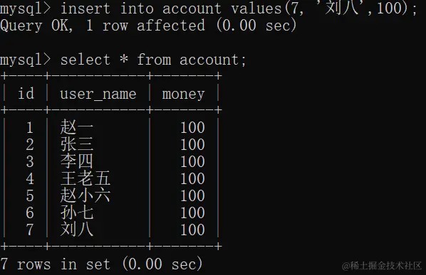 | 4 | start transaction; select * from account; insert into account values(7,'刘八',100); -此时已经发生修改 select * from account; | |