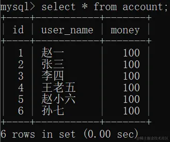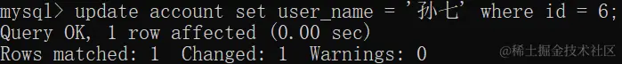| 4 | start transaction; select * from account; update account set user_name = '孙七' where id = 6; | |