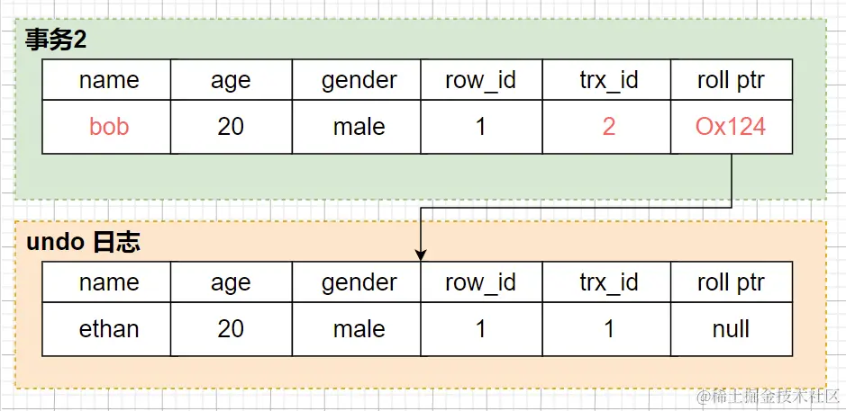 - 拷贝完成后,再修改该记录name 字段的 ethan 为 bob、修改隐藏字段的事务ID 为2,回滚指针指向拷贝到 undo log 的记录。