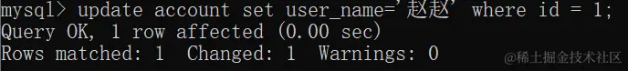 | 4 | start transaction; select * from account; update account set user_name='赵赵' where id = 1; -此时已经发生修改 select * from account; | |