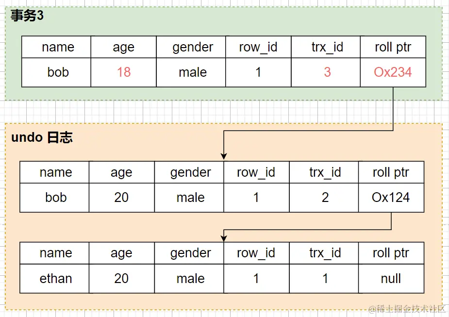 3.若第三个事务ID 为 3 对记录的age 字段进行了修改,将 20 修改为 18,则会出现: