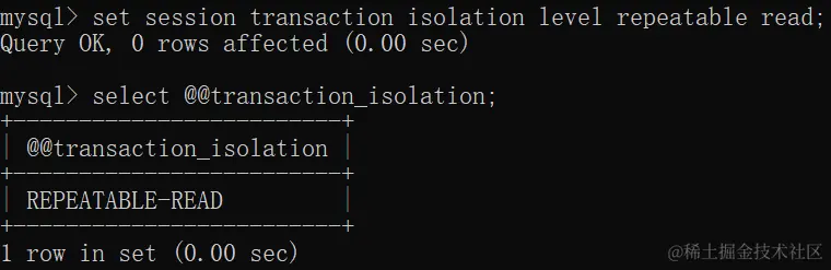 | 1 | -设置当前会话事务隔离级别为:可重复读 set session transaction isolation level repeatable read; select @@transaction_isolation; | |