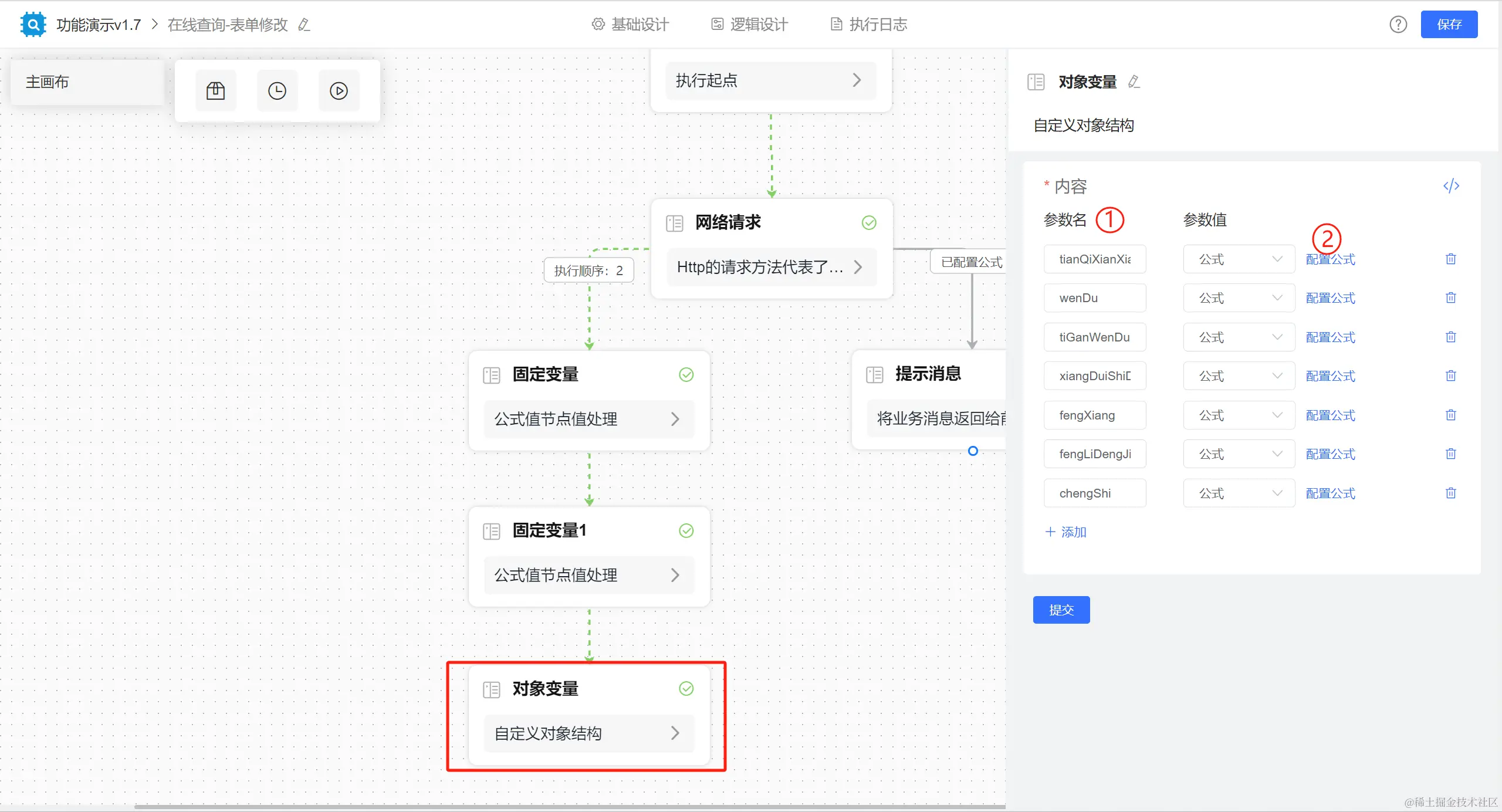 ①:按钮组件触发逻辑,远程调用接口获取到返回值后回显到表单中。