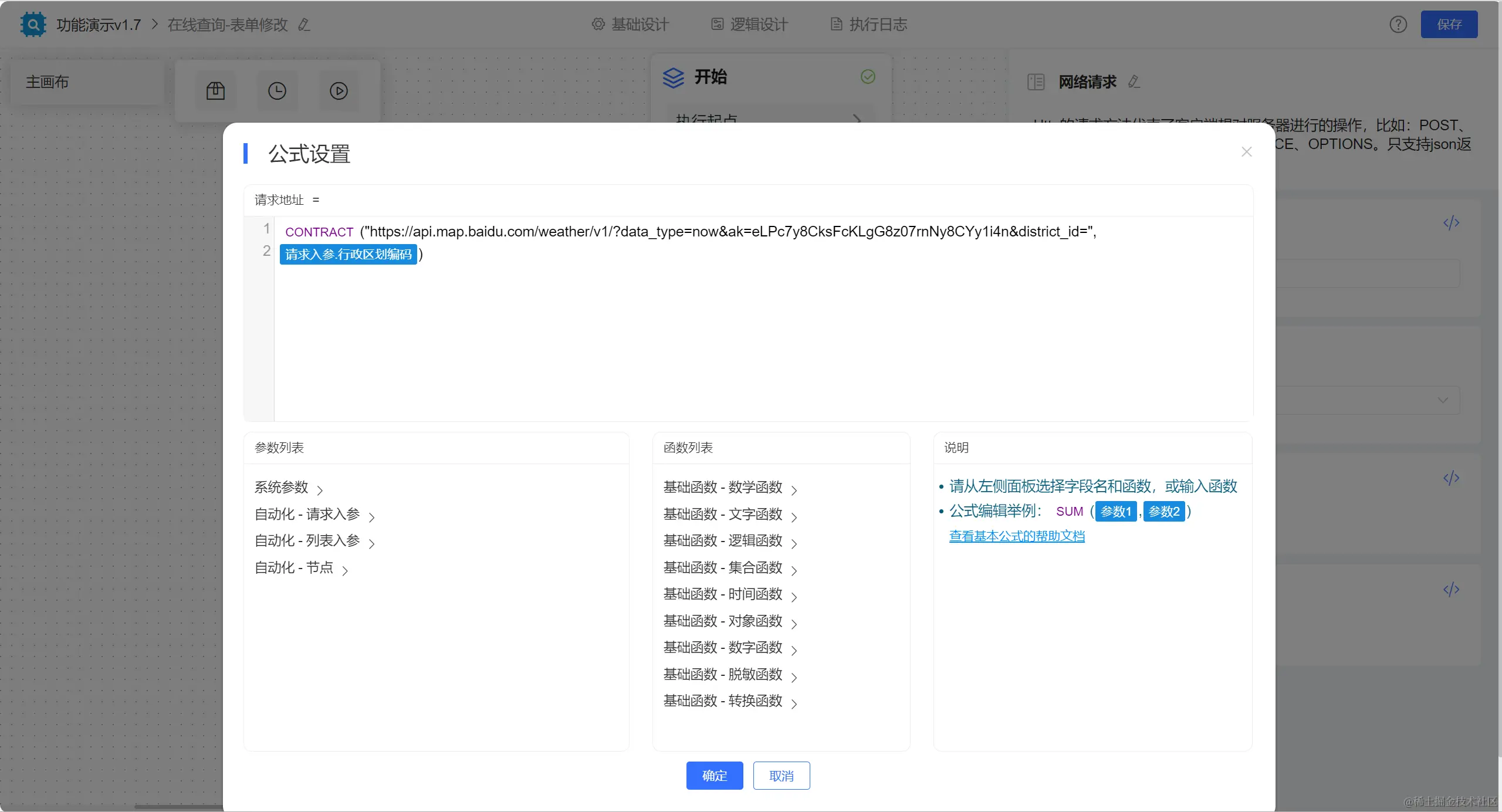 通过网络请求节点调用查询城市天气接口,城市天气查询接口需要加上城市编码查询,不能直接使用请求地址,需要配置函数公式获取: