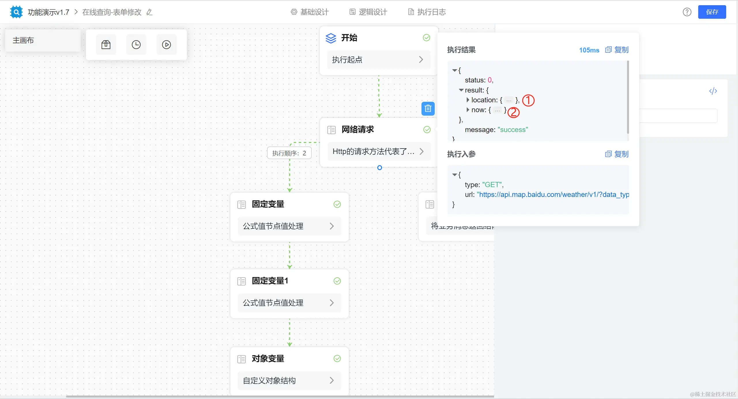 ②:网络请求接口返回的天气信息,用固定变量1节点获取。