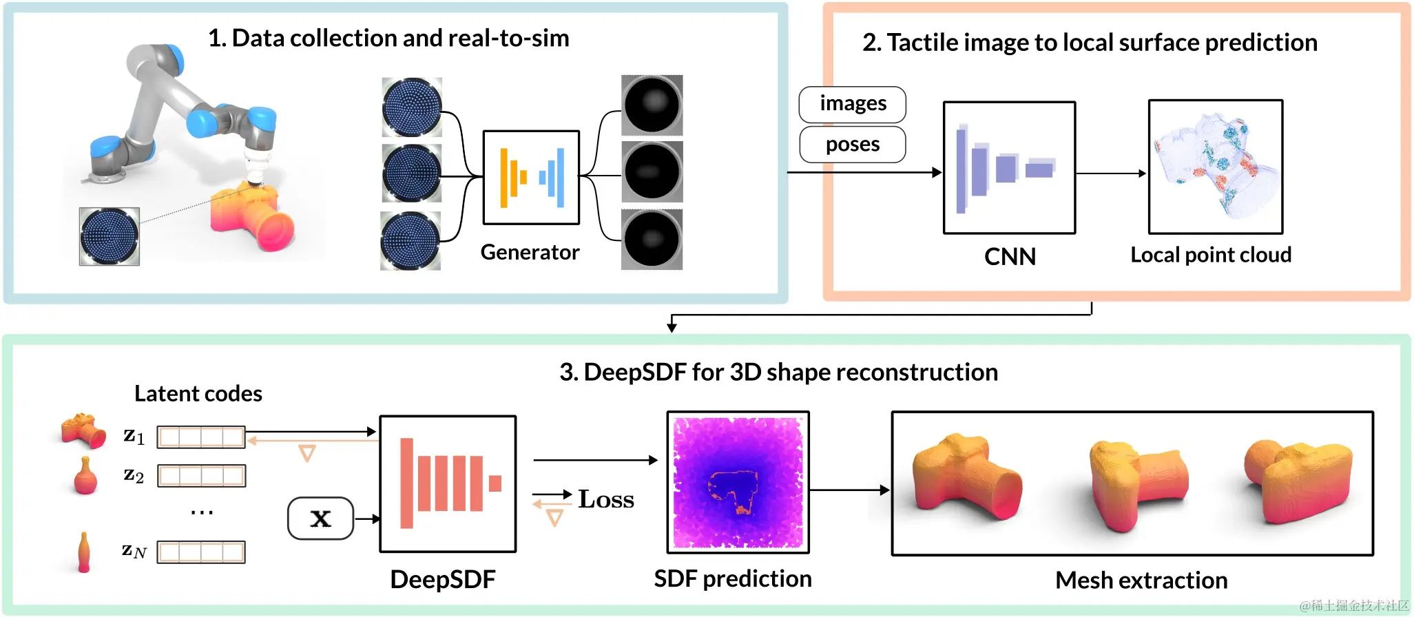 TouchSDF:首先机器人对物体表面进行采样,以获得真实的触觉图像(标记图案),然后将其转换为模拟图像(深度图)。其次卷积神经网络(CNN)将模拟图像映射到表示触摸位置处的局部对象表面的 3D 点集。最后预训练的DeepSDF模型根据多个接触点上的点云预测表示物体形状的连续符号距离函数(SDF)。