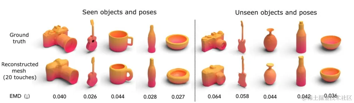 我们首次利用纯视觉触觉传感技术对现实世界中的一些三维打印物体和家用物体进行了三维形状重建评估。