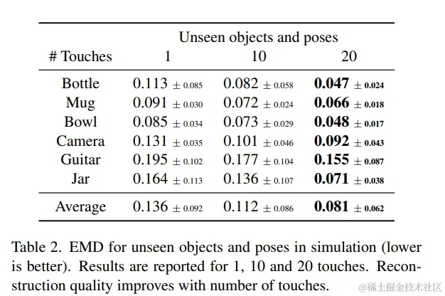 我们将我们的方法与Smith等人进行了比较。的仅触摸重建方法,使用地球移动器距离(EMD)、凸轮距离(CD)和表面重建误差作为度量。TouchSDF实现了更好的EMD和表面重建误差,尽管视觉质量更好,但CD却略低。