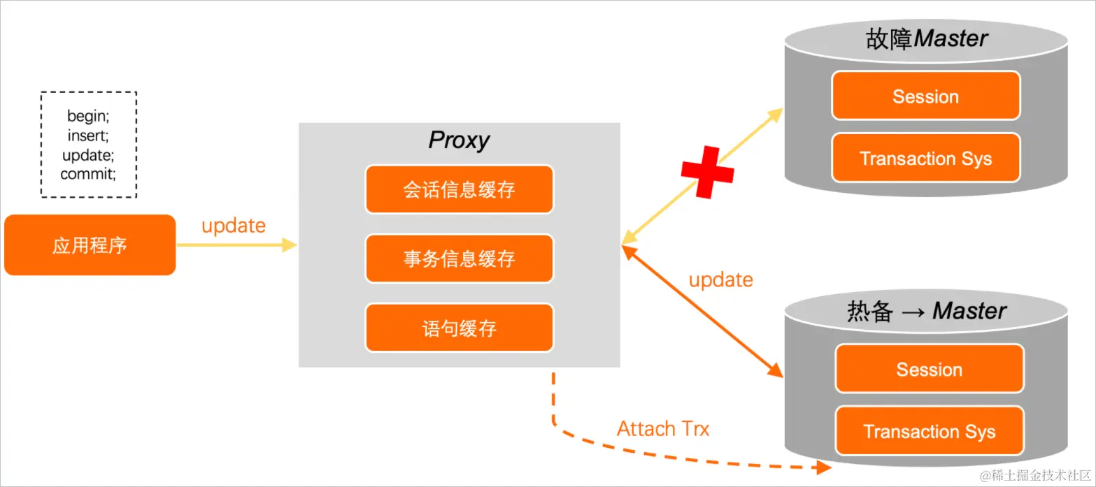 假设应用程序在 PolarDB 执行 UPDATE 的过程中,主节点出现故障。此时 PolarProxy 并不会立刻将底层的报错传给应用连接,而是将整个请求 hold 一段时间。热备切换选主之后,新的主节点通过Redo Log构建出所有的未提交事务,并异步等待未提交的事务,且暂时不进行回滚。