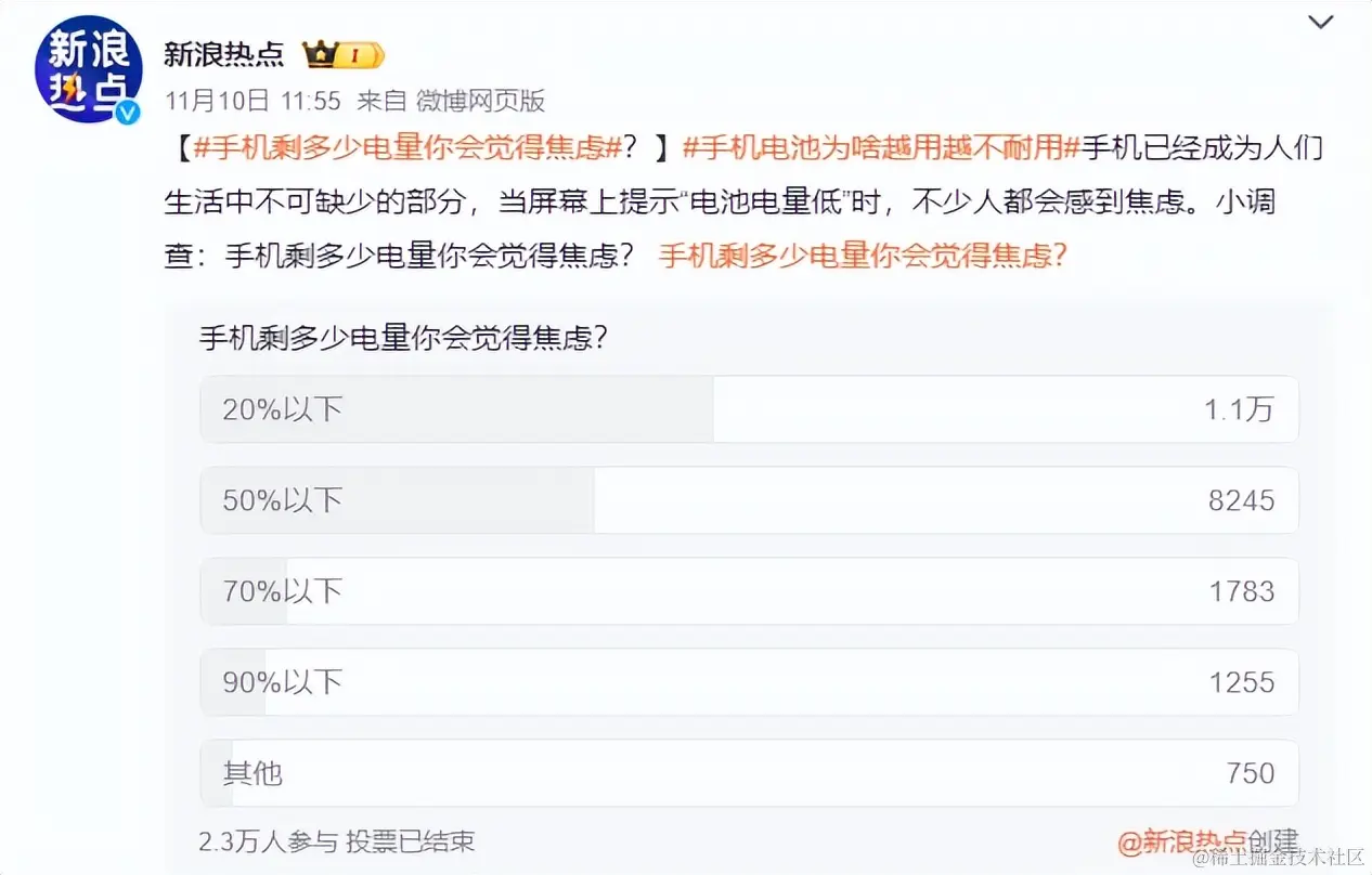 近日,一条#手机电量多少时你会感到焦虑#的微博话题引发网友热烈讨论,来自新浪热点的一份投票结果显示,尽管手机电池容量越做越大,很多用户仍存在“20%电量焦虑”(因手机电量低于20%,用户因电量不足而产生焦虑)。“只要不是100%就开始焦虑。”“只要可以及时充电都不焦虑,充不了电才会焦虑。”