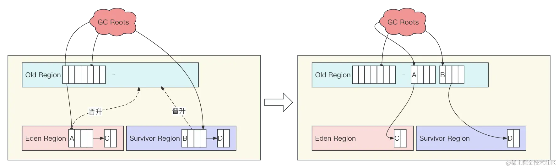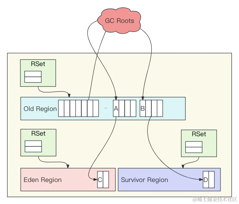 在G1 垃圾收集器中的对象是可以晋升的,和其它垃圾收集器类似当年轻代的对象存活超过一定时间之后,就可以从年轻代晋升为老年代。如上图所示,假设GC Roots分别引用了Eden Region 中的A对象和Survivor Region中的B对象,而在GC过程中这两个对象由于晋升等原因被移动到了Old Region。而此时,对象A和B依旧还是引用了处于Eden和Survivor中的C、D对象,这也就发生了跨区域(Region)的引用。