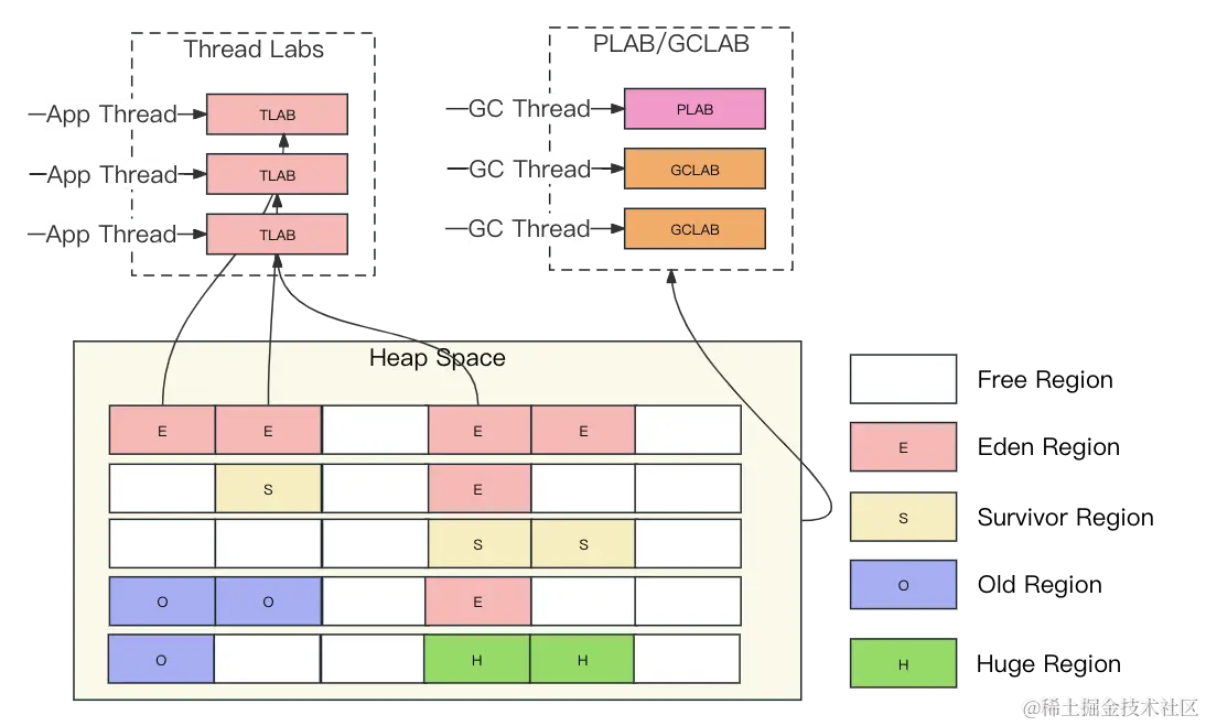 TLAB(Threads Local Allocation Buffer,线程本地分配缓冲区): 每一个应用线程(App thread)都可以独占一个本地缓冲区(即Region)来创建对象,TLAB通常属于 Eden 空间,因为大部分对象会首先在 Eden 区被分配(大型对象除外)。