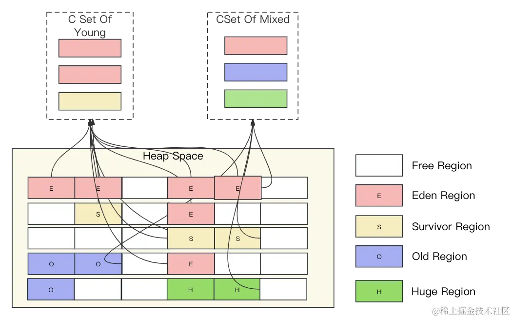 由于G1收集器分为Young GC和Mixed GC两种模式,因此存在着两种不同的CSet分别在这两种模式下使用: