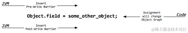 屏障(Barrier)是指在原生代码片段中,当某些语句被执行时,屏障代码也会被执行。而G1主要在赋值语句中,使用写前屏障(Pre-Write Barrier)和写后屏障(Post-Write Barrier),如下: