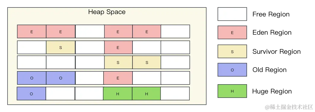 虽然G1内存分区不要求内存分配是非连续的,但它依然逻辑上将内存划分为年轻代和老年代。然而,和CMS等分代的垃圾回收器不同,G1垃圾回收器不是将一大块连续的内存区域划分成年轻代和老年代,而是将每一个分区(Region)划分成Eden区、Survivor区、Huge区和Old区等。