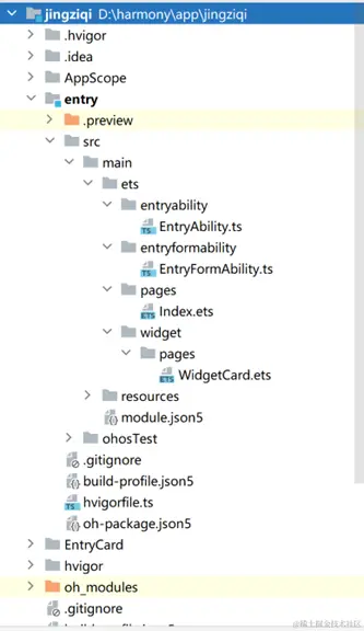 这里有几个重要的文件,首先是 EntryAbility.ts,这个文件对应的是 UIAbility,通俗的理解就是,当用户想要通过与万能卡片的交互打开一个类似 app 页面的时候,那么打开的页面就可以看做是一个 UIAbility;接着是 EntryFromAbility.ts,这个是卡片的 Ability,可以做卡片的数据更新,或者与 UIAbility 相关的交互等;Index.ets 就是默认打开的页面了;而 WidgetCard.ets 则是卡片的页面;如果想要设置元服务的标题,可以在 AppScope/resources/base/element/string.json 中修改 value 的值。