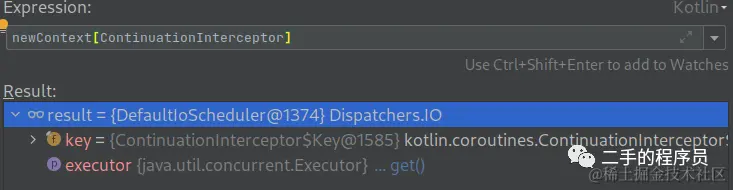 可以看到,它会判断如果旧的 context 里面有Dispatchers(也叫 ContinuationInterceptor),那么就不添加,如果没有,那么就添加一个 Dispatchers.Default。
