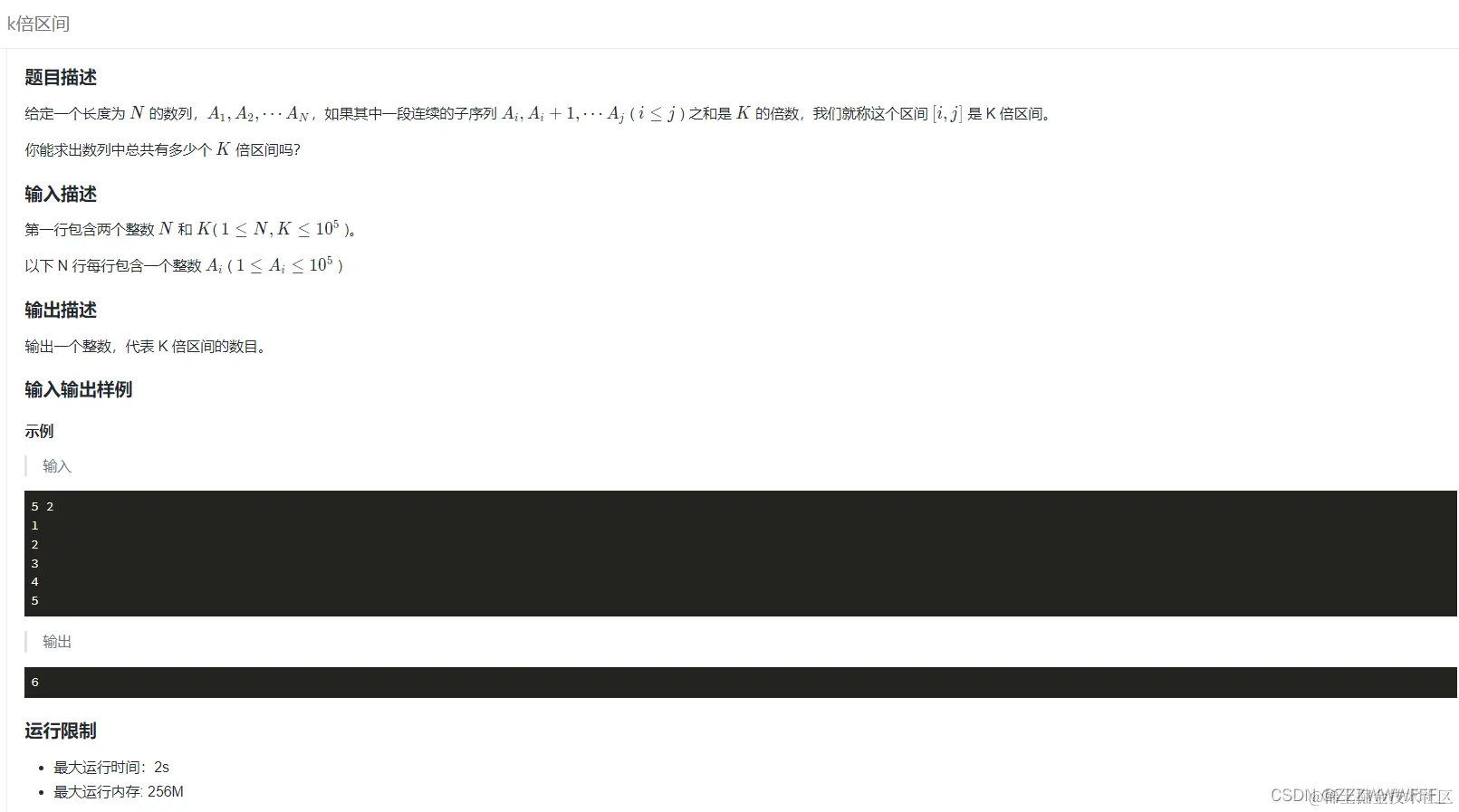 首先给出这个数学结论,即————两个数(a,b)与另外一个数(c)取模后得到相等的一个数(d)时,这两个数(a,b)的差一定是c的倍数————这样的两个数区间即k倍区间!!!!!