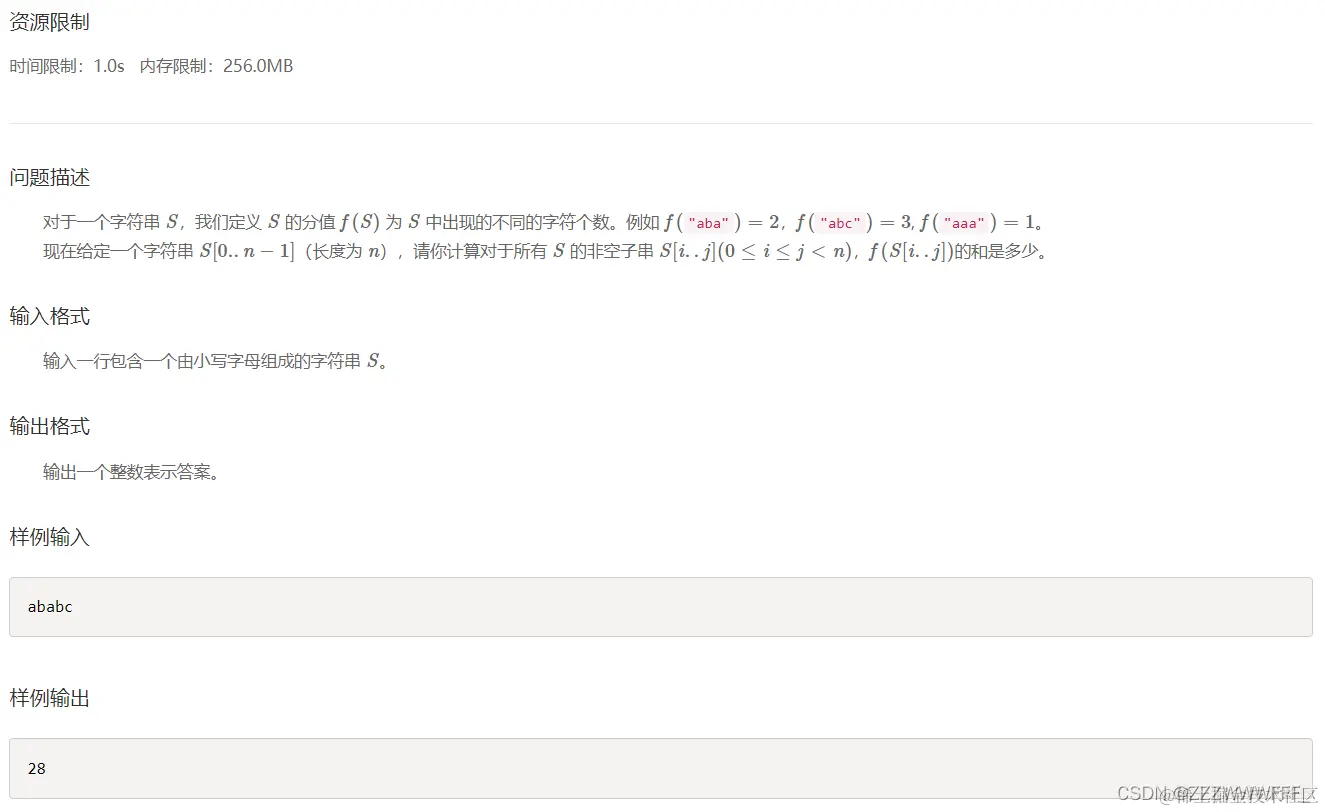 以上笔记分别借鉴于(1条消息) 【2020蓝桥杯省赛】【字符串】子串分值(详解!)(两种解法)_NOT_TODAY1的博客-CSDN博客_蓝桥杯子串分值和(1条消息) 十一届蓝桥杯 子串分值和(一看就会)_littletomorrow的博客-CSDN博客_蓝桥杯子串分值和