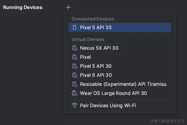 现在可以直接从 Running Devices 窗口中点击图标并选择设备来启动 Android 虚拟设备 (AVD),或开始镜像物理设备+,要停止物理设备的 AVD 或镜像,可以直接关闭设备 tab。